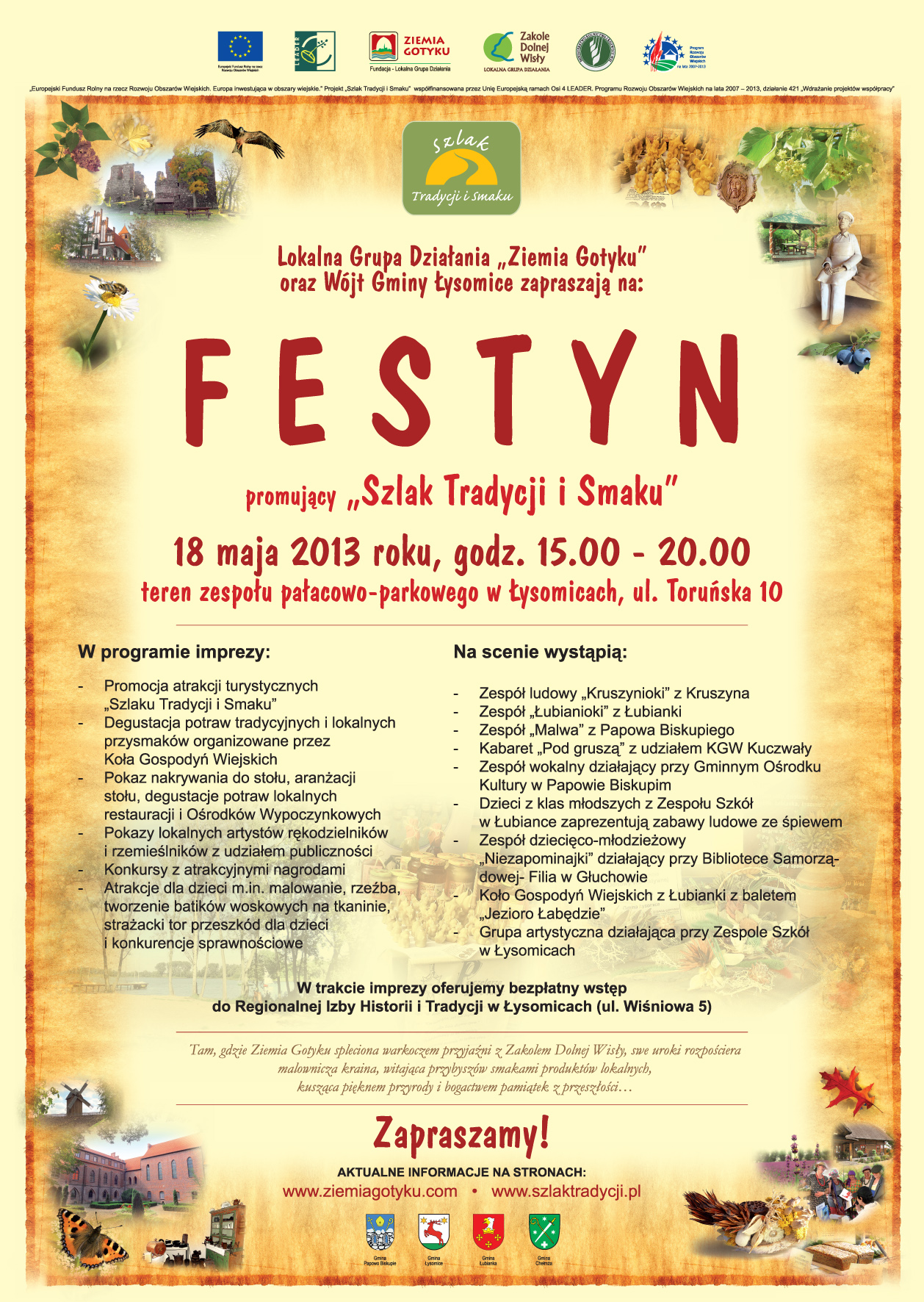 W dniu 18 maja 2013 roku na terenie Zespołu Pałacowo-Parkowego w Łysomicach odbędzie się wydarzenie kulminacyjne projektu "Szlaku Tradycji i Smaku" w Fundacji "Ziemia Gotyku" Lokalna Grupa Działania. Będzie to impreza promocyjna pn. Festyn „Szlaku Tradycji i Smaku”.