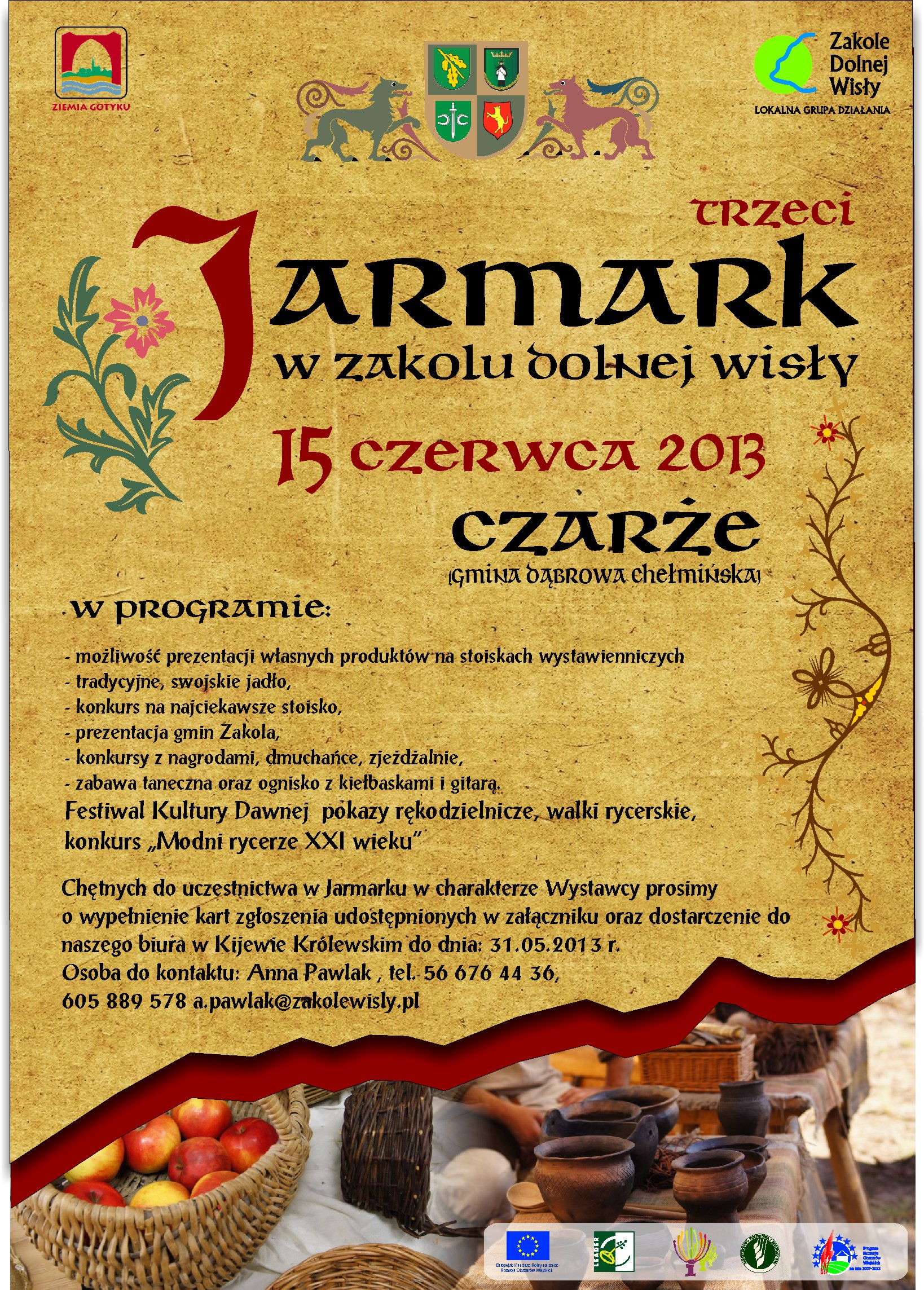 Serdecznie zapraszamy na III Jarmark w Zakolu Dolnej Wisły, jaki odbędzie się całkiem niebawem - 15 czerwca 2013 r. w Czarżu. Regulamin oraz wzór karty zgłoszenia znajdują się na stronie internetowej Zakola Dolnej Wisły TUTAJ